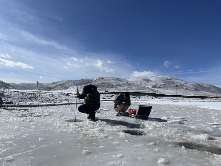 2023年1月3日,青海省水文水資源測報中心工作人員在青海省玉樹(shù)藏族自治州隆寶河進(jìn)行破冰測流。(受訪(fǎng)單位供圖)