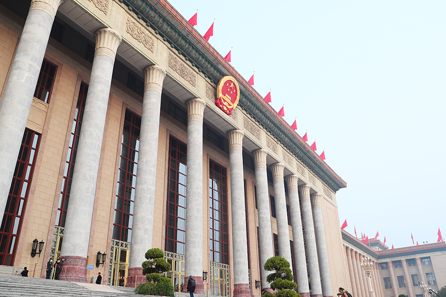 3月5日(星期日)上午9時(shí),第十四屆全國人民代表大會(huì )第一次會(huì )議在人民大會(huì )堂舉行開(kāi)幕會(huì )。圖為人民大會(huì )堂外景。(新華網(wǎng)記者 焦鵬 攝)