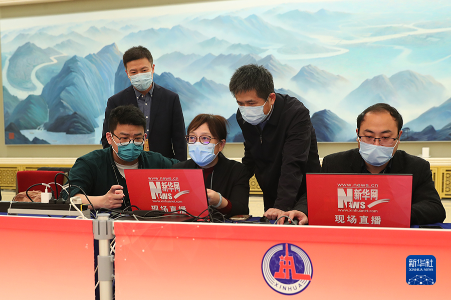 3月5日下午3時(shí),全國政協(xié)十四屆一次會(huì )議在人民大會(huì )堂三樓金色大廳舉行民主黨派中央和全國工商聯(lián)領(lǐng)導人記者會(huì ),請各民主黨派中央主席和全國工商聯(lián)主席出席并回答記者提問(wèn)。圖為現場(chǎng)直播團隊正在進(jìn)行直播。新華網(wǎng)記者 焦鵬 攝