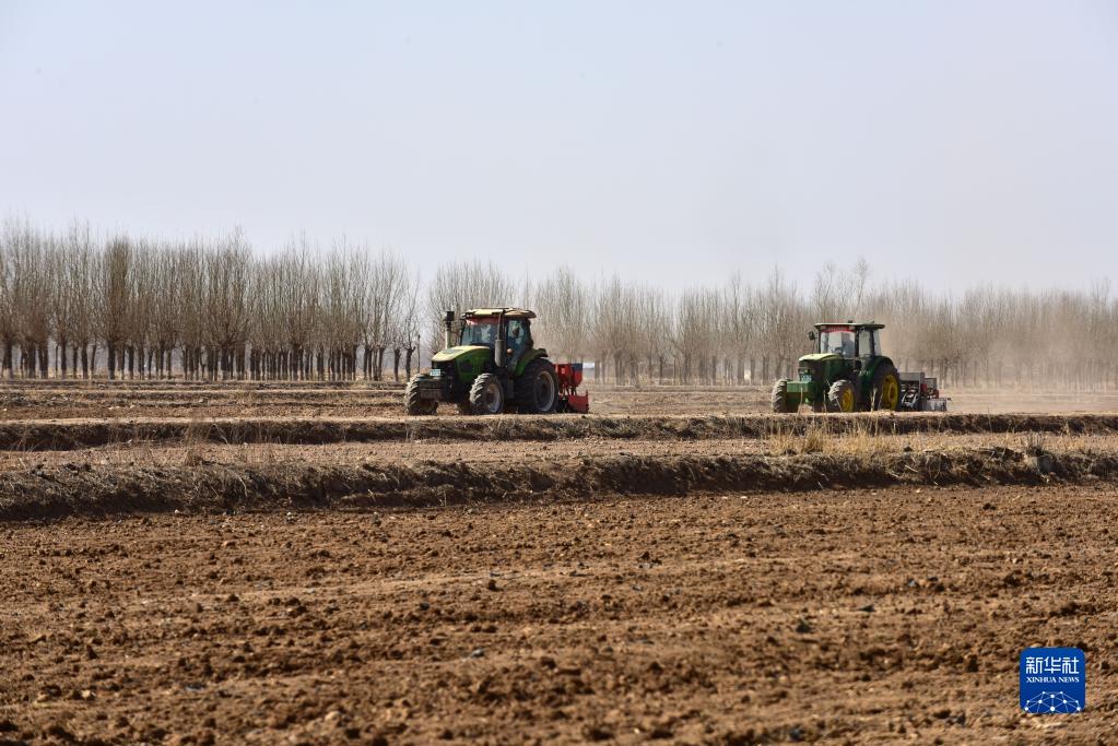 在寧夏銀川市賀蘭縣立崗鎮蘭星村,農民駕駛農機播種春小麥(2023年3月3日攝)。新華社記者 李旭倫 攝