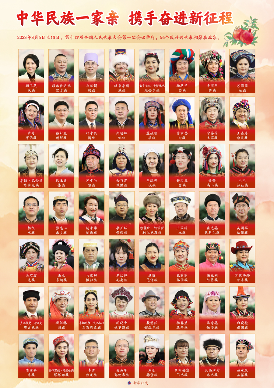 2023年3月5日至13日,第十四屆全國人民代表大會(huì )第一次會(huì )議舉行,56個(gè)民族的代表相聚在北京。