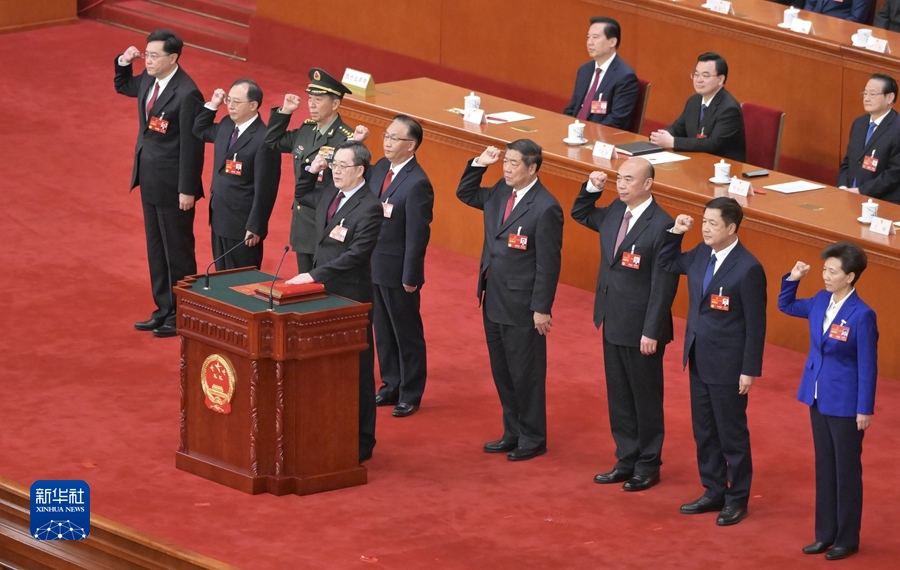 3月12日,十四屆全國人大一次會(huì )議在北京人民大會(huì )堂舉行第五次全體會(huì )議。根據國務(wù)院總理李強的提名,經(jīng)投票表決,決定丁薛祥、何立峰、張國清、劉國中為國務(wù)院副總理,李尚福、王小洪、吳政隆、諶貽琴、秦剛為國務(wù)委員,吳政隆為國務(wù)院秘書(shū)長(cháng)。這是國務(wù)院副總理、國務(wù)委員、秘書(shū)長(cháng)進(jìn)行憲法宣誓。
