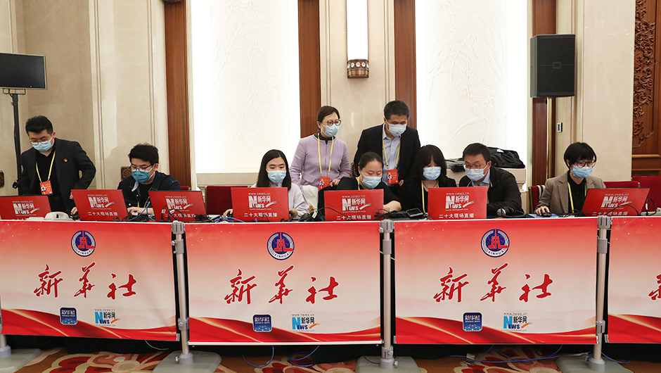 中國共產(chǎn)黨第二十次全國代表大會(huì )新聞發(fā)言人于2022年10月15日(星期六)16時(shí)30分在人民大會(huì )堂舉行新聞發(fā)布會(huì )。圖為記者在現場(chǎng)工作。(新華網(wǎng) 王翰林 攝)