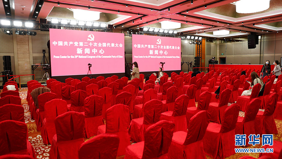 10月17日(星期一)15:00,二十大新聞中心將在梅地亞新聞中心二層新聞發(fā)布廳舉辦第二場(chǎng)記者招待會(huì )。圖為記者招待會(huì )前新世紀日航飯店三層世紀廳分會(huì )場(chǎng)。(新華網(wǎng) 陳杰 攝)
