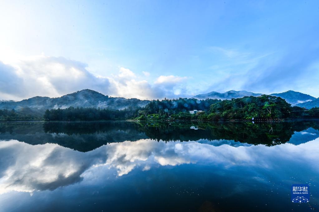 這是2020年9月4日拍攝的晨曦中的海南熱帶雨林國家公園尖峰嶺和尖峰嶺天池景色。新華社記者 蒲曉旭 攝