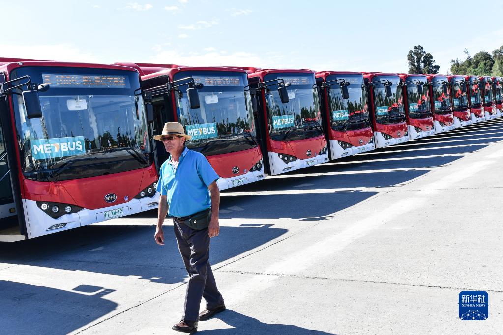 2018年12月13日,在智利首都圣地亞哥的奧伊金斯公園,一名男子從比亞迪電動(dòng)大巴旁走過(guò)。新華社發(fā)(豪爾赫·比列加斯攝)