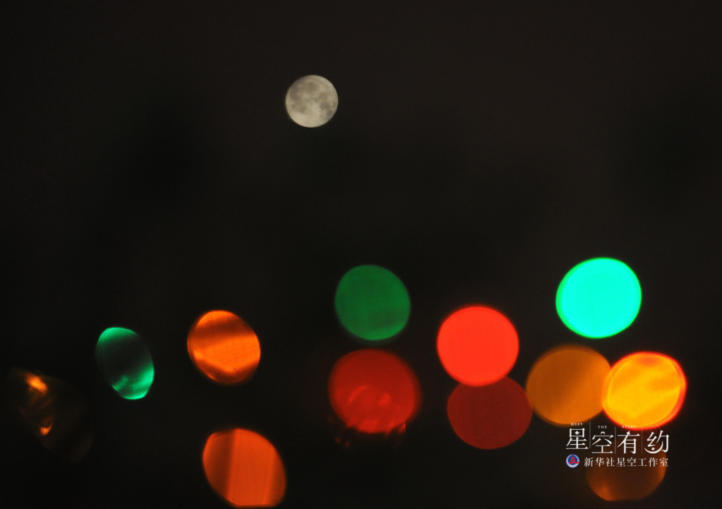 2013年2月24日元宵節,北京夜空的月亮與五彩繽紛的燈飾相映成輝。這一年的元宵月是“十七圓”。(新華社記者何俊昌 攝)
