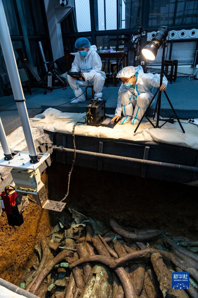 在三星堆遺址考古發(fā)掘現場(chǎng)3號“祭祀坑”,考古人員用高光譜成像掃描儀對文物進(jìn)行光譜拍攝,以識別文物的材料和屬性(2021年3月16日攝)。新華社記者 沈伯韓 攝
