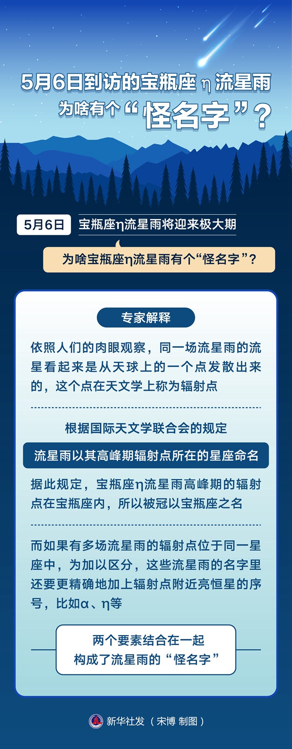 新華社南京5月5日電(記者王玨玢、邱冰清)5月6日,寶瓶座η流星雨將迎來(lái)極大期。對這場(chǎng)有著(zhù)哈雷彗星“血統”的流星雨,很多公眾心懷期待。為啥寶瓶座η流星雨有個(gè)“怪名字”?流星雨到底從哪來(lái)?天文科普專(zhuān)家帶您從科學(xué)視角揭開(kāi)流星雨的秘密。
