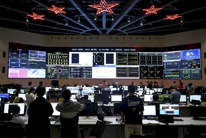 這是實(shí)驗成功后的全超導托卡馬克核聚變實(shí)驗裝置(EAST)控制大廳(2023年4月12日攝)。新華社記者 黃博涵 攝