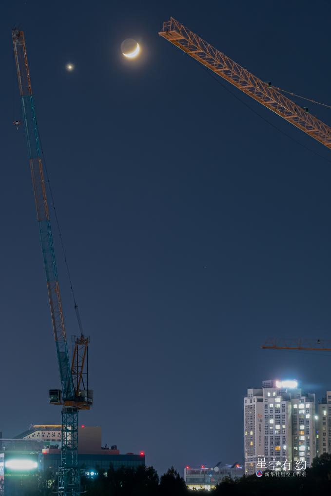 山東省天文攝影愛(ài)好者王昊2023年5月23日在韓國光州廣域市拍攝的金星伴月。(本人供圖)