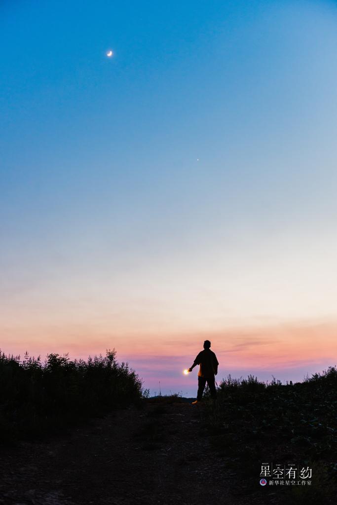 “20日傍晚時(shí)分,農歷六月初三的一彎新月掛在西邊天空,像女孩的眉毛,又像彎彎的鐮刀。在新月左下方稍遠一點(diǎn)的地方,很亮的那顆星就是金星,兩者之間的角距離大約8度,相當于16個(gè)滿(mǎn)月視直徑(約為0.5度)大小,上演‘深情遙望’的浪漫一幕?!毙蘖Ⅸi說(shuō)。