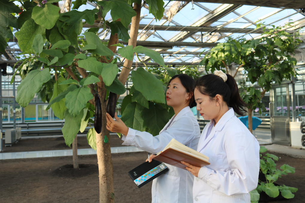 北大荒建三江國家農業(yè)科技園區里,工作人員正在查看山茄樹(shù)上嫁接生長(cháng)的茄子長(cháng)勢。(受訪(fǎng)者供圖)