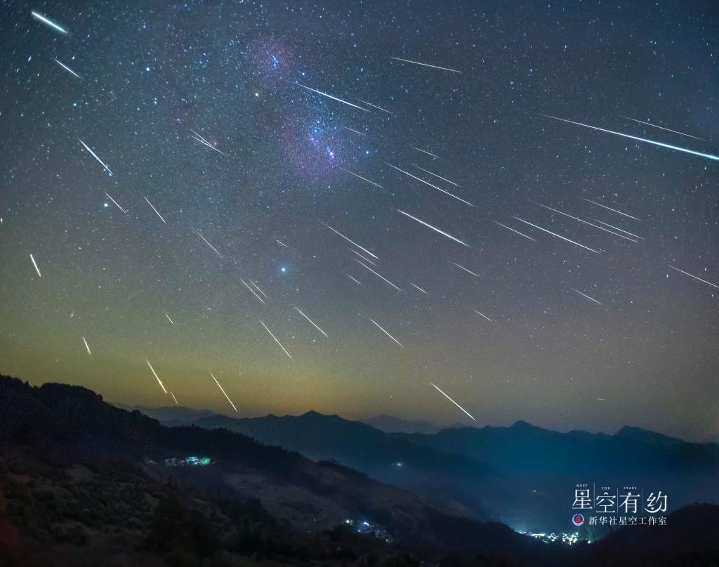 安徽星空攝影愛(ài)好者王藝胤2022年12月14日在安徽黃山市歙縣石潭村拍攝的雙子座流星雨(多張疊加)。(本人供圖)
