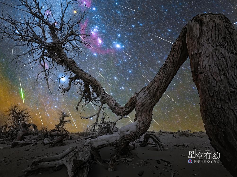 甘肅星空攝影愛(ài)好者王添瑋2020年12月13日在內蒙古額濟納旗怪樹(shù)林景區拍攝的雙子座流星雨(多張疊加)。(本人供圖)