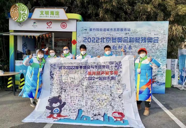 2月6日,林家萱(左二)、陳文成(左四)等參與城市志愿服務(wù)的臺胞手持簽名背景版合影。受訪(fǎng)者供圖