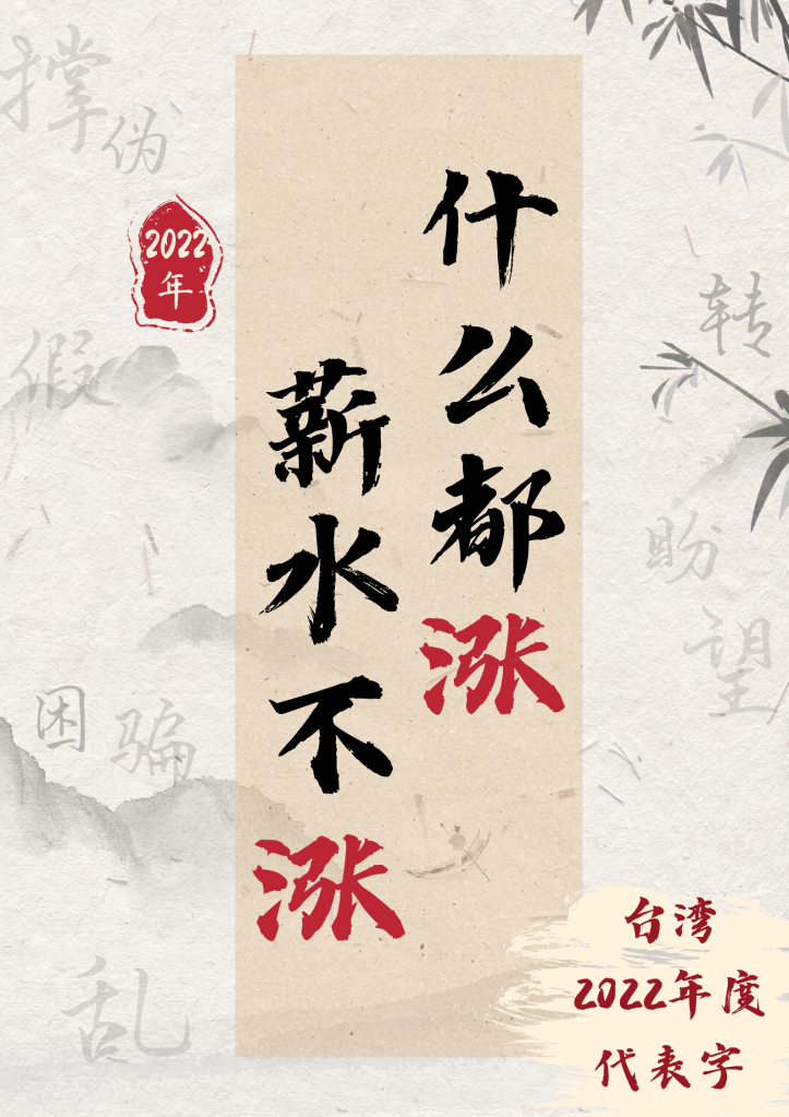 《聯(lián)合報》等島內媒體、機構主辦的臺灣2022年度代表字評選中,“漲”字奪冠?!斑@反映了臺灣當下的現實(shí):什么都漲,就薪水不漲,不少人生活陷入困境,苦不堪言?!迸_灣時(shí)事評論員賴(lài)岳謙說(shuō)。
