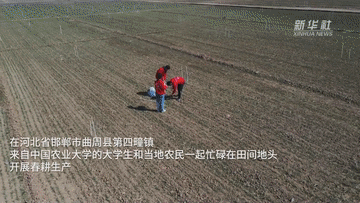 在河北省邯鄲市曲周縣第四疃鎮,來(lái)自中國農業(yè)大學(xué)的大學(xué)生和當地農民一起忙碌在田間地頭,開(kāi)展春耕生產(chǎn)。