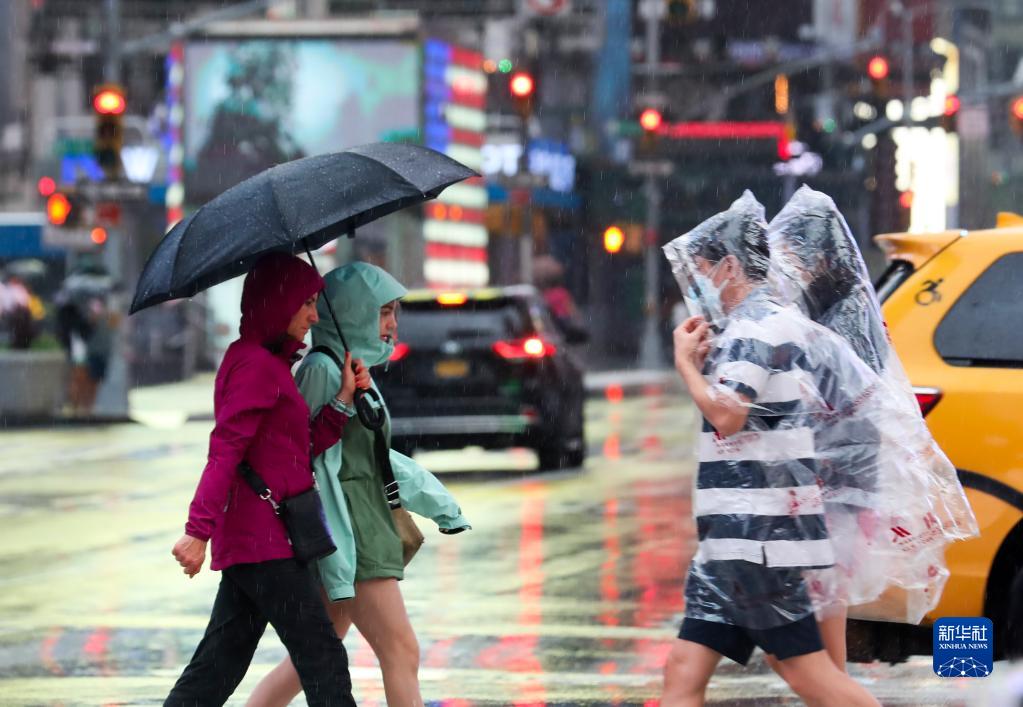 8月22日,人們行走在雨中的美國紐約時(shí)報廣場(chǎng)上。受熱帶風(fēng)暴“亨利”影響,美國紐約當日迎來(lái)降雨天氣。新華社記者 王迎 攝