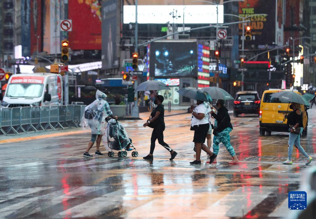 8月22日,人們行走在雨中的美國紐約時(shí)報廣場(chǎng)上。受熱帶風(fēng)暴“亨利”影響,美國紐約當日迎來(lái)降雨天氣。新華社記者 王迎 攝