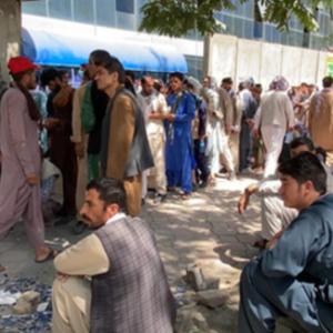 8月26日,人們在阿富汗喀布爾一家銀行外排隊。