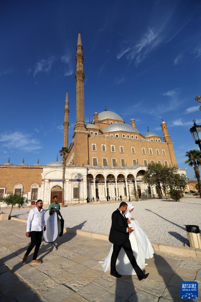10月14日,一對新人在埃及首都開(kāi)羅的薩拉丁城堡內拍攝婚紗照。
