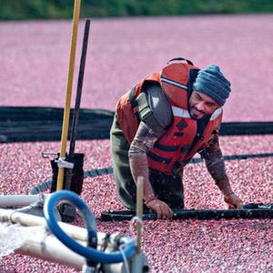 蔓越莓也稱(chēng)小紅莓,因果實(shí)小且生長(cháng)在低矮密實(shí)的枝蔓上而難以手工采摘,通常要靠引水灌田,再用機械打落使其漂浮,方可收集。