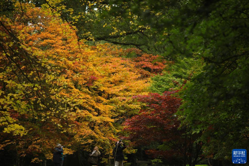 10月27日,游客在英國格洛斯特郡的韋斯頓伯特植物園欣賞秋景。