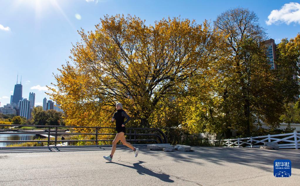 11月2日,一名女子在美國芝加哥林肯公園動(dòng)物園跑步。