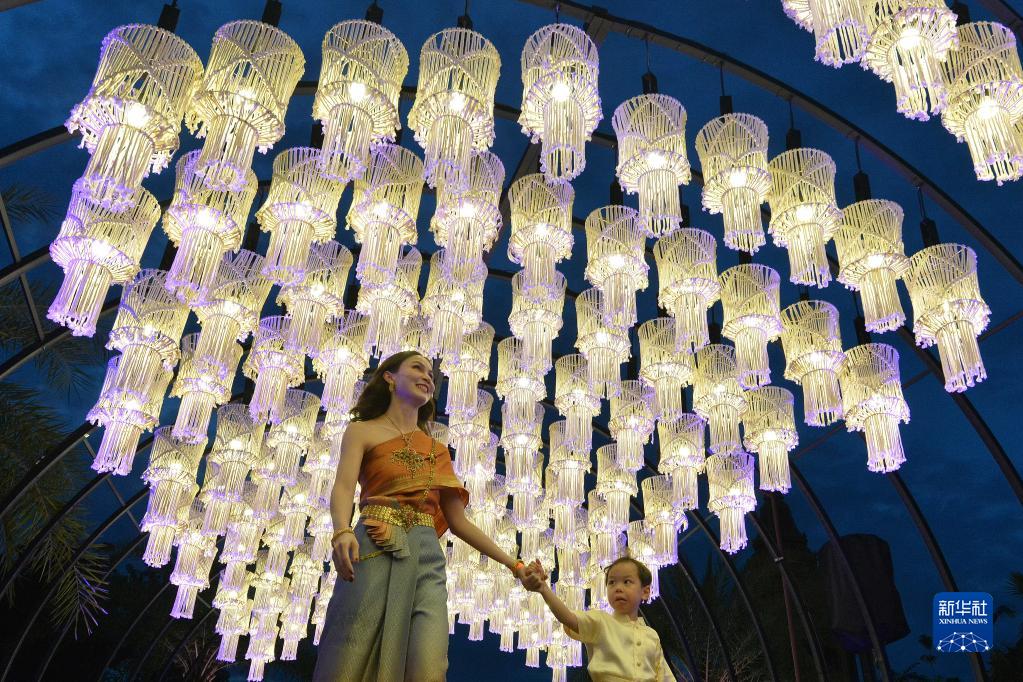 11月8日,游客在泰國北欖府舉行的國際燈籠美食節預展活動(dòng)上觀(guān)賞燈籠。