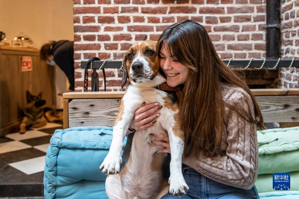 12月22日,在法國北部城市里爾名為Waf Cafe的咖啡館,顧客與狗狗互動(dòng)。