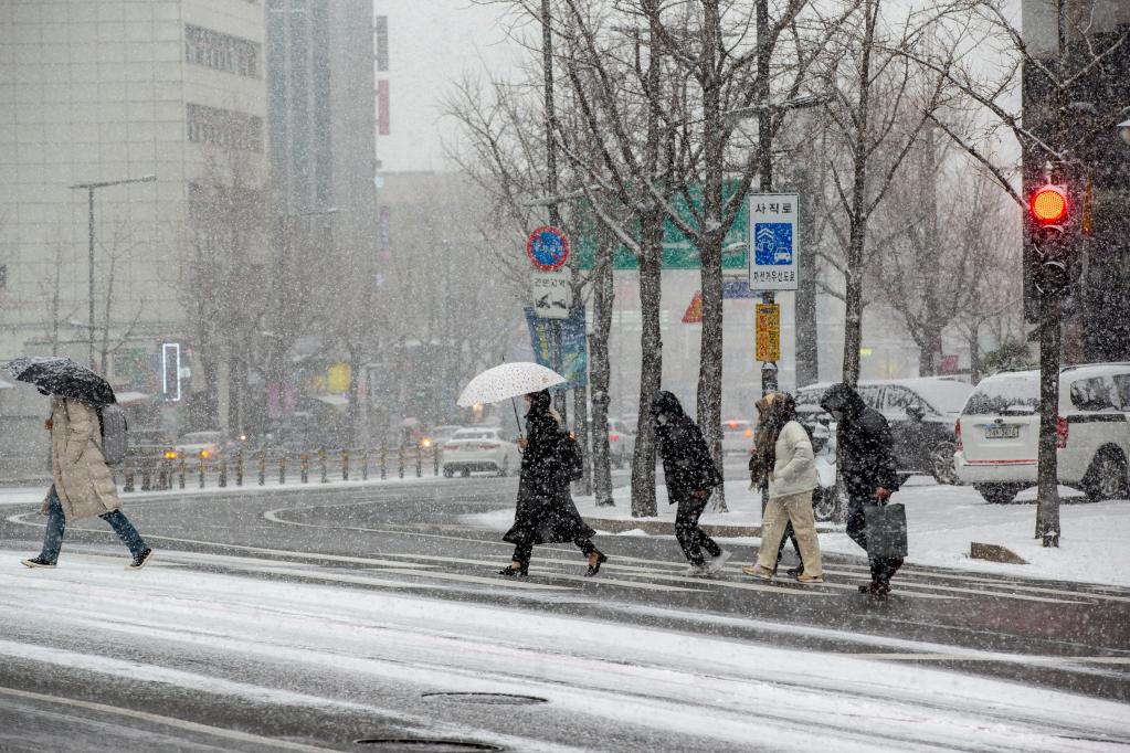 12月18日,在韓國首爾,行人在雪中過(guò)馬路。新華社記者王益亮攝