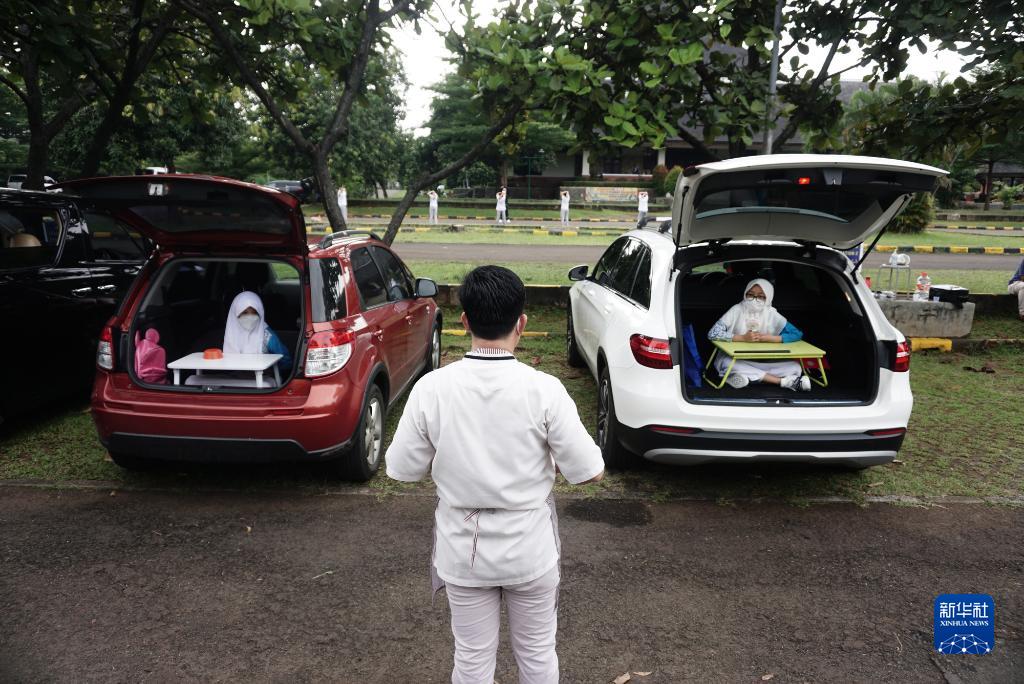 2021年4月5日,教師在印度尼西亞首都雅加達為在后備箱中學(xué)習的學(xué)生授課,在確保新冠防疫要求的情況下采取靈活方式進(jìn)行面對面教學(xué)。