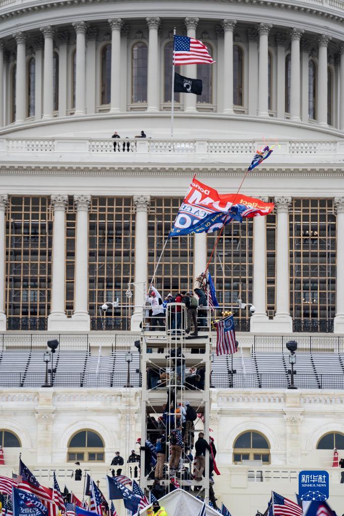 2021年1月6日,特朗普支持者在美國首都華盛頓的國會(huì )大廈前舉行示威時(shí)占據下屆總統就職典禮的媒體拍攝高臺。當日,大批支持時(shí)任美國總統特朗普的示威者強行闖入美國國會(huì )大廈,與警方發(fā)生沖突,造成5人死亡多人受傷。