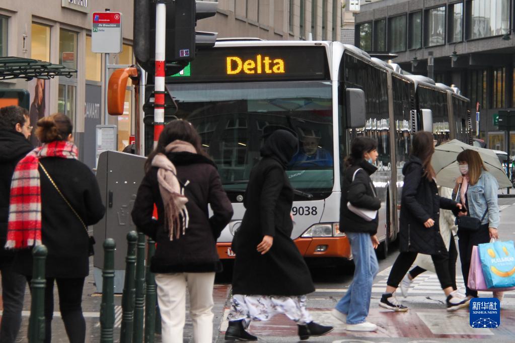 2021年11月5日,終點(diǎn)為“德?tīng)査钡墓卉?chē)行駛在比利時(shí)布魯塞爾街頭。自2021年11月以來(lái),歐洲再次成為全球疫情的“震中”,德?tīng)査局晔菤W洲地區蔓延的主要新冠病毒。