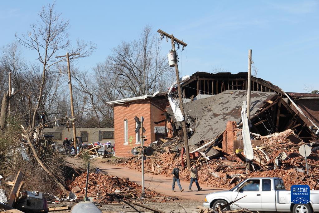 這是2021年12月14日在美國肯塔基州梅菲爾德拍攝的破損房屋。2021年12月10日晚至11日清晨,超過(guò)30場(chǎng)龍卷風(fēng)襲擊了美國中部6個(gè)州,導致88人死亡,大量建筑損毀,基礎設施被破壞,經(jīng)濟損失慘重。