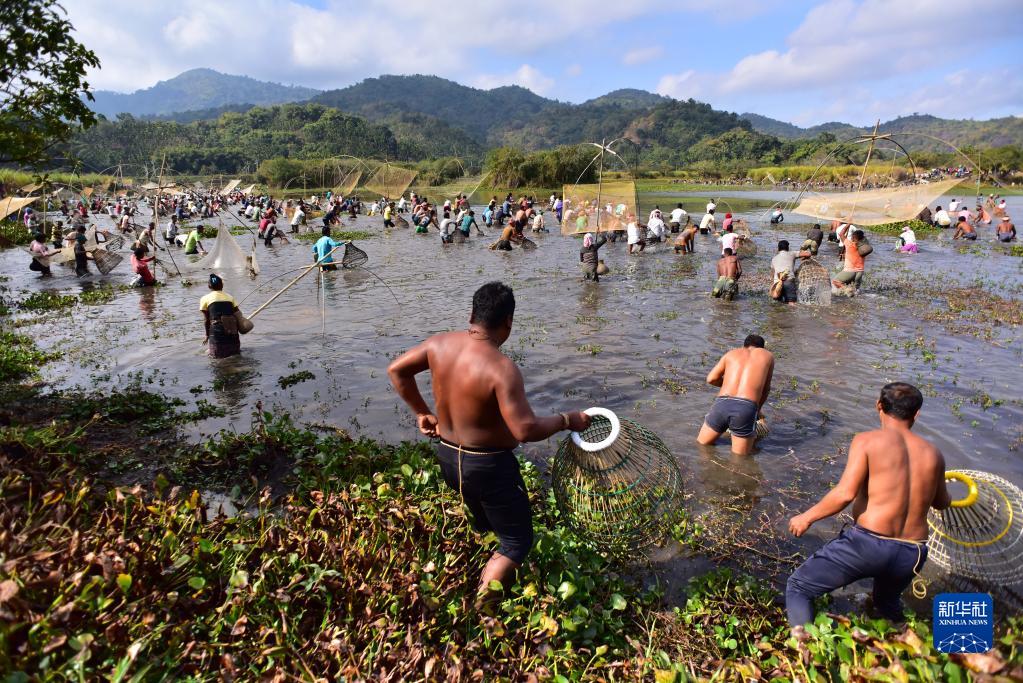 1月13日,在印度阿薩姆邦高哈蒂一處村莊,當地村民參加捕魚(yú)活動(dòng),慶祝收獲季的結束。新華社發(fā)