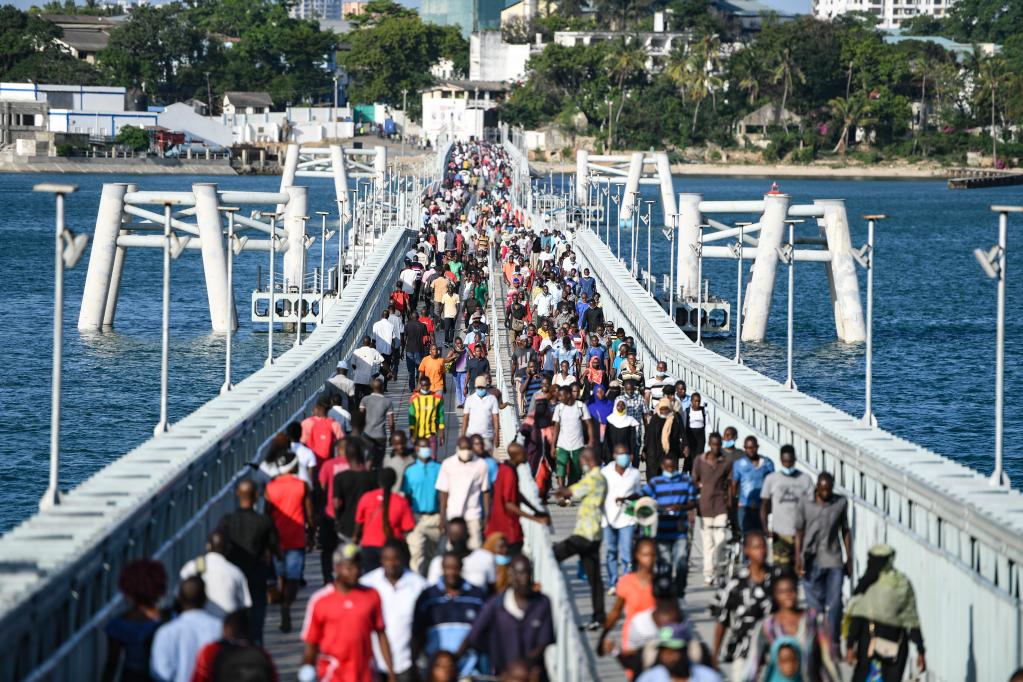 2022年1月4日,在肯尼亞蒙巴薩,當地居民在利科尼浮橋上通行。新華社記者龍雷攝