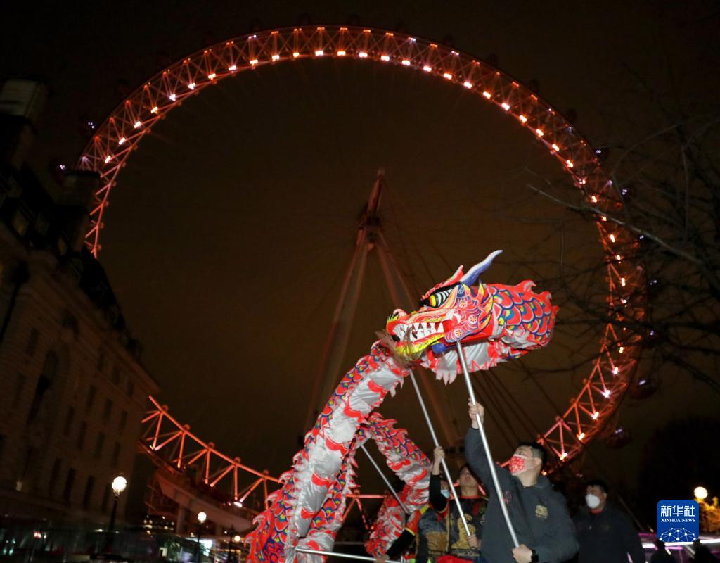 1月28日,在英國倫敦,演員在亮起“中國紅”的“倫敦眼”前表演舞龍。