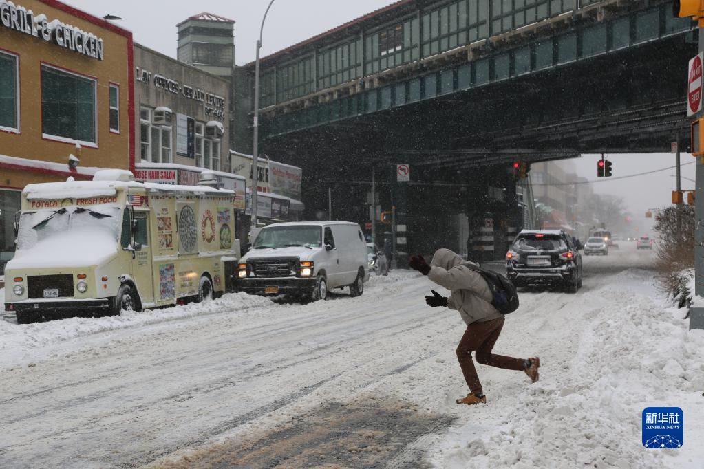1月29日,一名行人在美國紐約穿過(guò)積雪的道路。