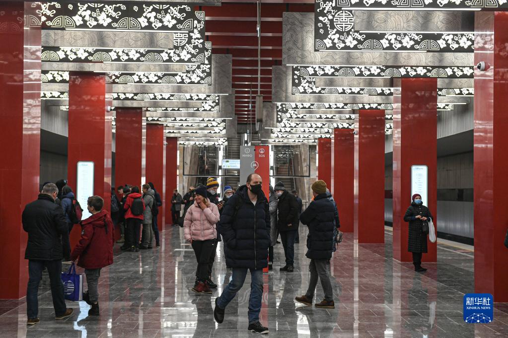 2021年12月7日,在俄羅斯首都莫斯科,乘客走在由中國鐵建承建的莫斯科地鐵第三換乘環(huán)線(xiàn)西南段米丘林大街站內。新華社發(fā)(葉甫蓋尼·西尼岑攝)