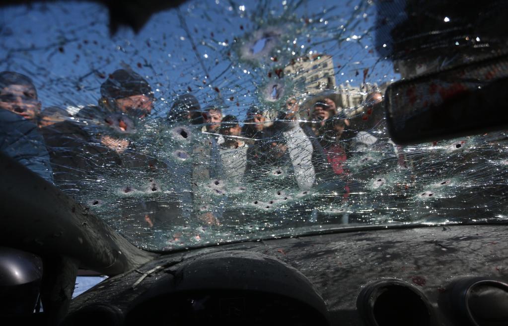 2月8日,在約旦河西岸城市納布盧斯,人們聚集在被以軍打死的3名巴勒斯坦人的車(chē)旁。(新華社發(fā),艾曼·諾巴尼攝)