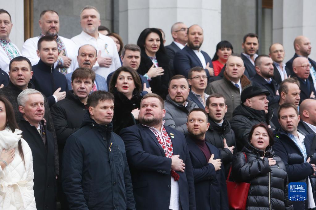 2月16日,在烏克蘭首都基輔,議員們在最高拉達(議會(huì ))門(mén)前的憲法廣場(chǎng)參加團結日慶?;顒?dòng)。