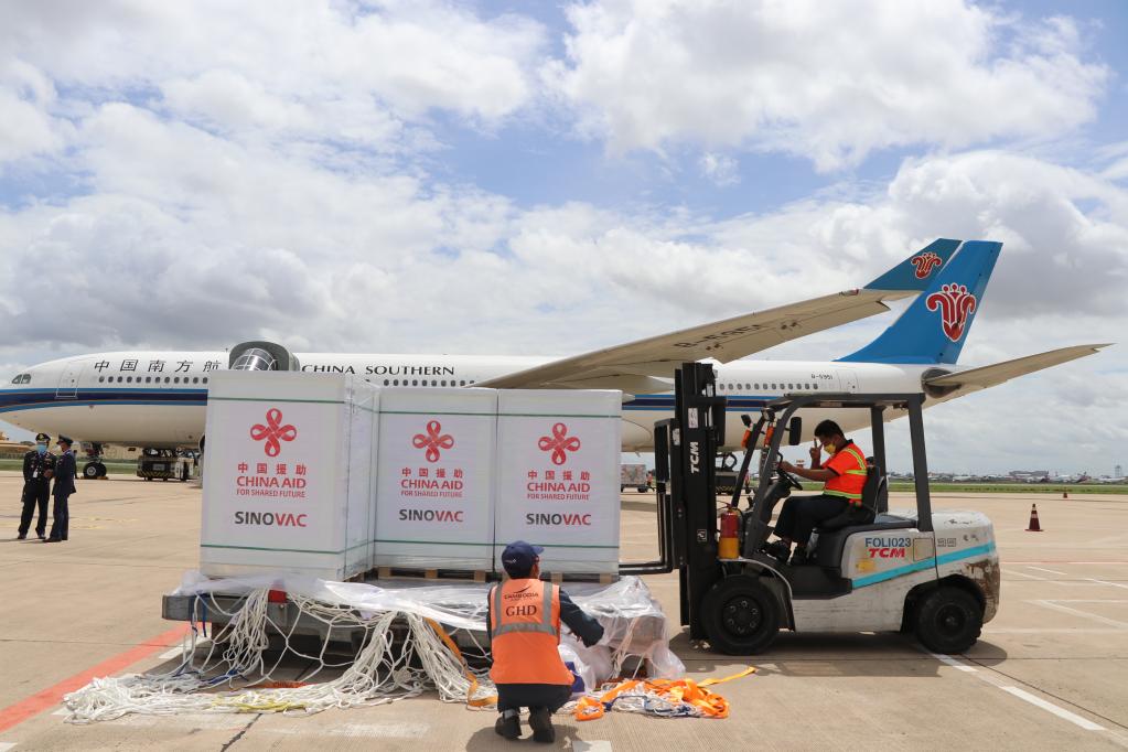 2021年10月14日,工作人員在柬埔寨金邊國際機場(chǎng)運輸中國政府援助柬埔寨的科興新冠疫苗。(新華社記者毛鵬飛攝)