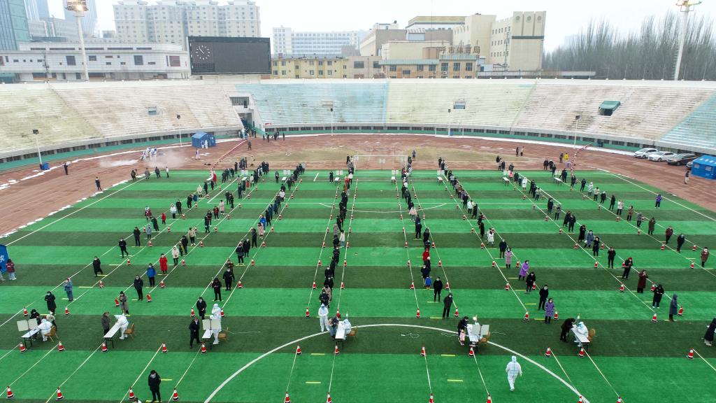 2月17日,在呼和浩特市人民體育場(chǎng)臨時(shí)核酸檢測點(diǎn),周邊居民進(jìn)行核酸檢測(無(wú)人機拍攝)。(新華社記者彭源攝)
