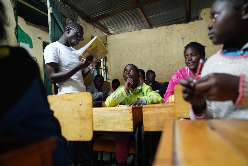 4月28日,在位于肯尼亞內羅畢馬薩雷一所小學(xué),一名教師在教室授課。新華社記者董江輝攝