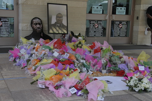 2020年6月9日,在美國得克薩斯州休斯敦,舉行弗洛伊德葬禮的教堂外擺滿(mǎn)鮮花。(新華社發(fā),勞承躍攝)