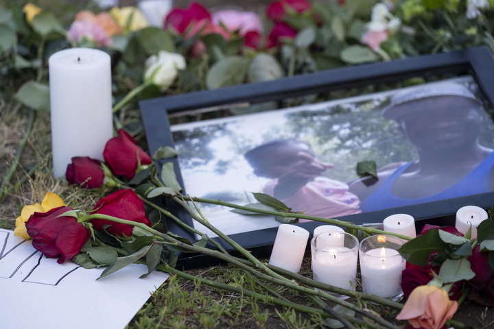 2021年5月25日,在美國華盛頓白宮附近舉行的悼念弗洛伊德的集會(huì )上,人們將鮮花和蠟燭擺放在弗洛伊德和家人的照片旁。(新華社記者 劉杰 攝)