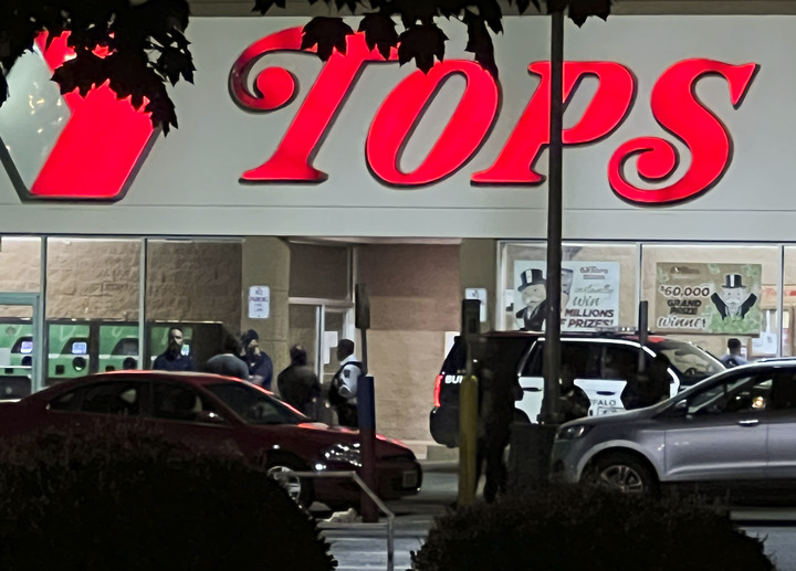 5月15日凌晨,警察在美國紐約州布法羅市的槍擊案現場(chǎng)工作(手機拍攝)。(新華社發(fā),張杰攝)