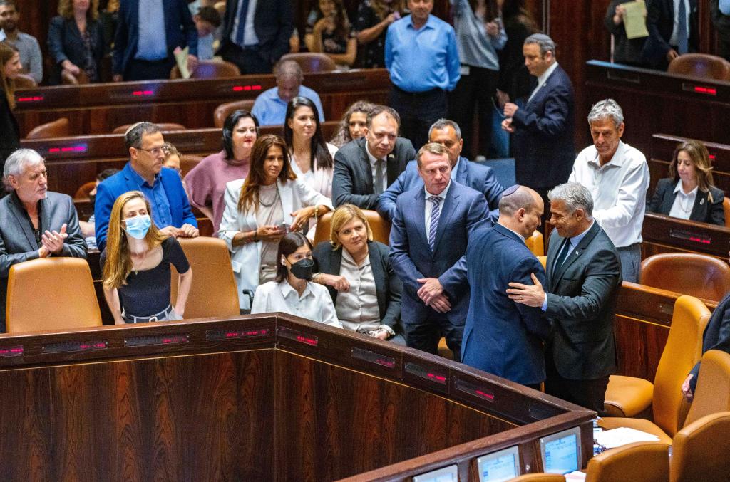 6月30日,在位于耶路撒冷的以色列議會(huì ),貝內特(前右二)和拉皮德(前右一)參加議會(huì )全會(huì )。(新華社/基尼圖片社)
